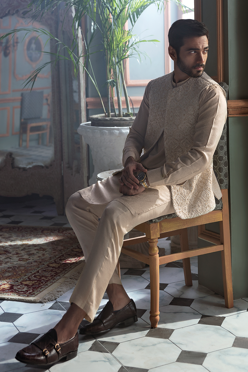 PEARL WHITE KARANDI FABRIC WAISTCOAT , DETAILED HAND EMBELLISHED ALL OVER