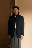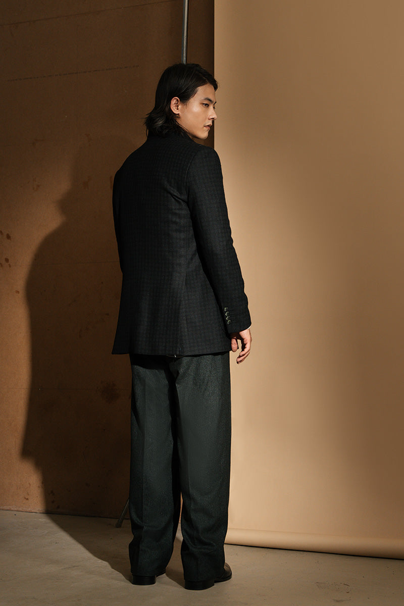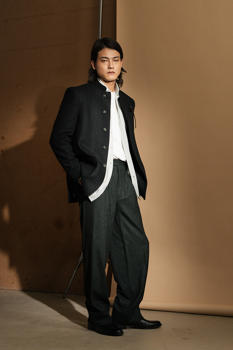 A tailored black prince jacket in a checkered woolen fabric detailed with a band collar and button closures.