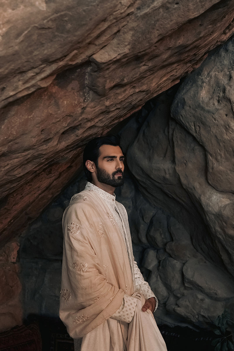 Our heritage tone-on-tone shawl in a luxurious, cotton silk yarn with hand embroidered workmanship and geometric, embellished borders.
