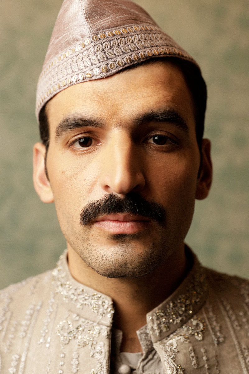 Silver gray, self-jamawar bandh gala jacket, with embroidered geometric and floral patterns, detailed with sequins and tilla adda work on hem and band collar.