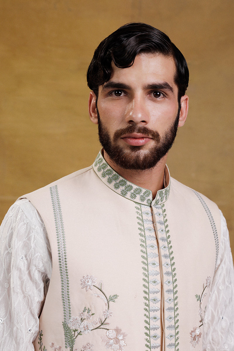 Sand brown waistcoat, with mid-century floral pattern, detailed with sequins and tilla.