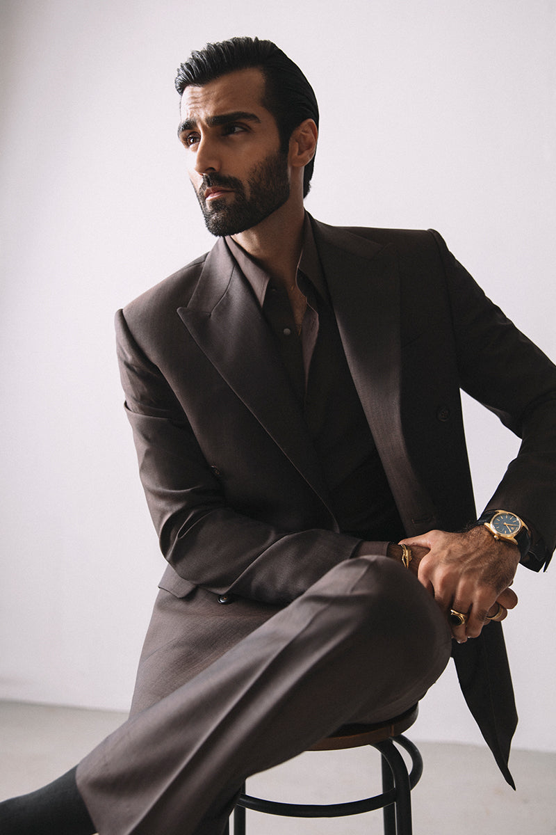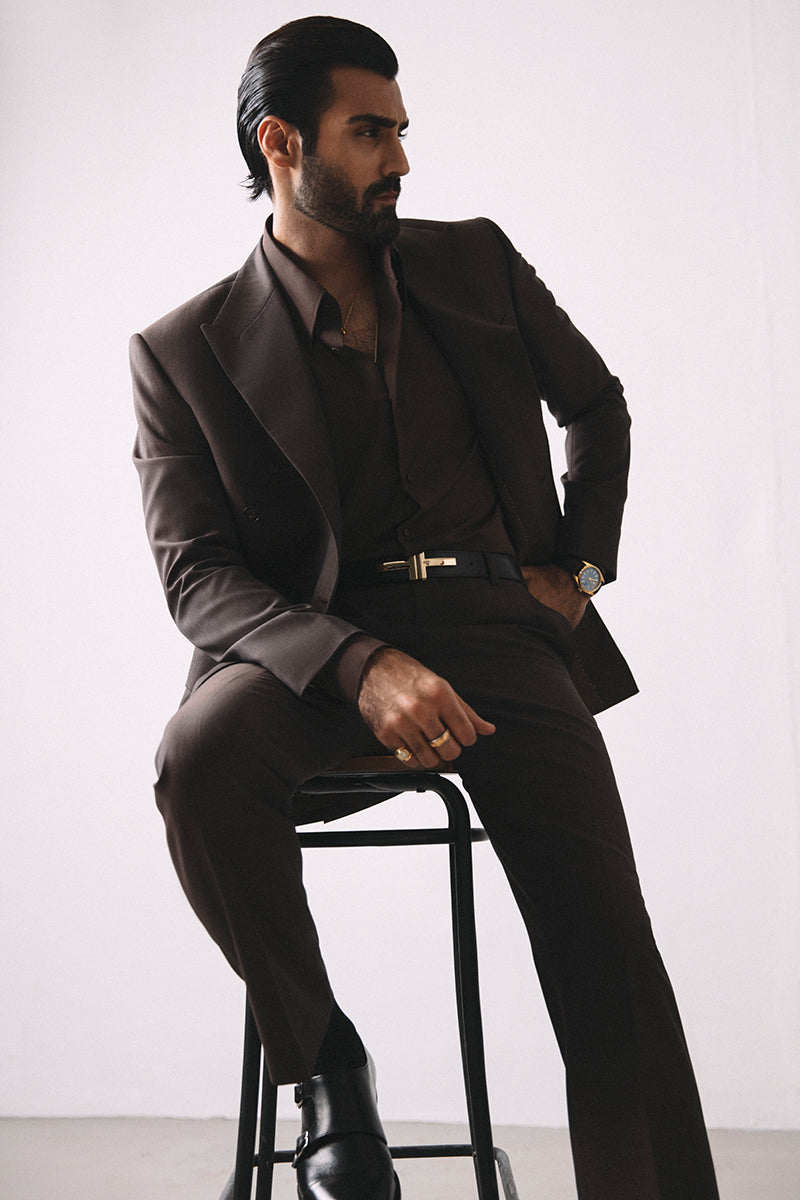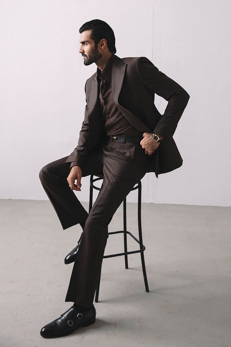 Dark brown, tropical herringbone fabric double breasted suit, with wide spread peak lapel. Detailed with jilted pockets and double slit.