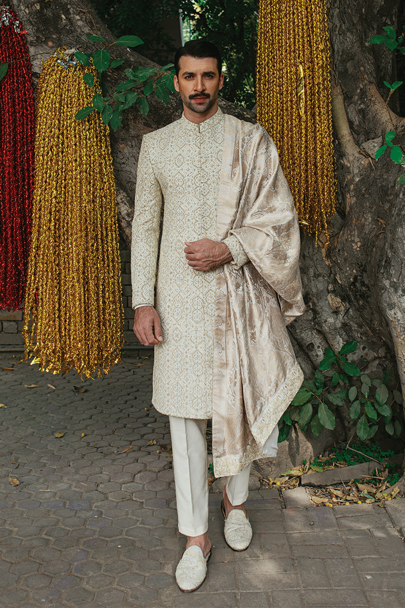 Ivory gold geometrical embroidery merged with miniature damask motif entirely hand embellished