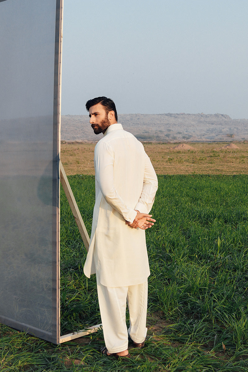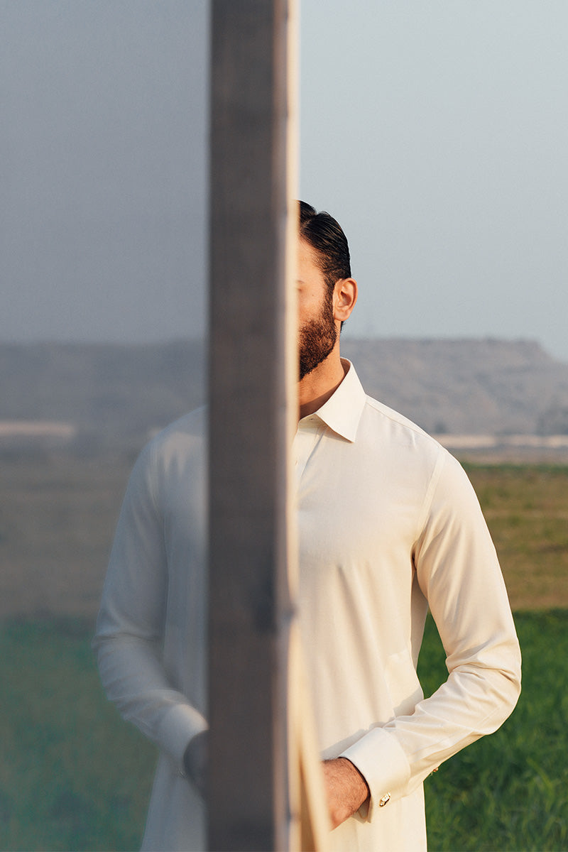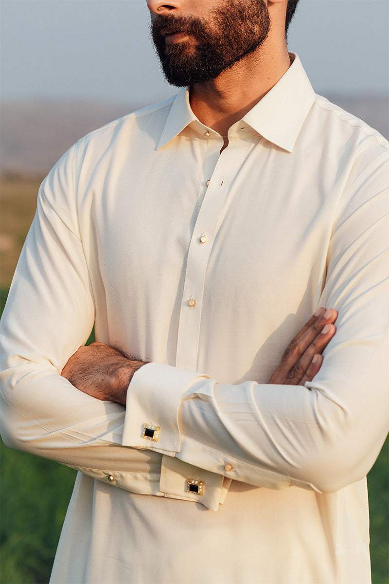 A classic cream toned shalwar kameez in a premium boski fabric detailed with a french collar and gold buttons.