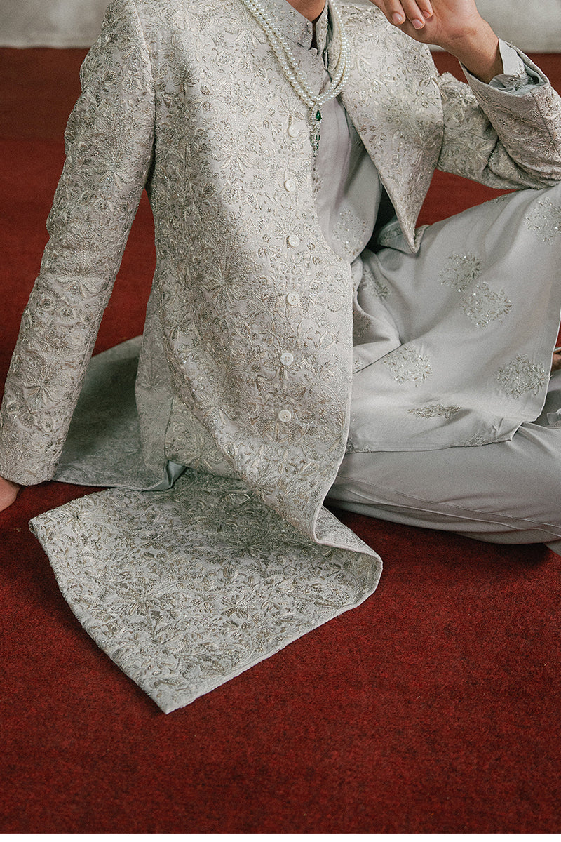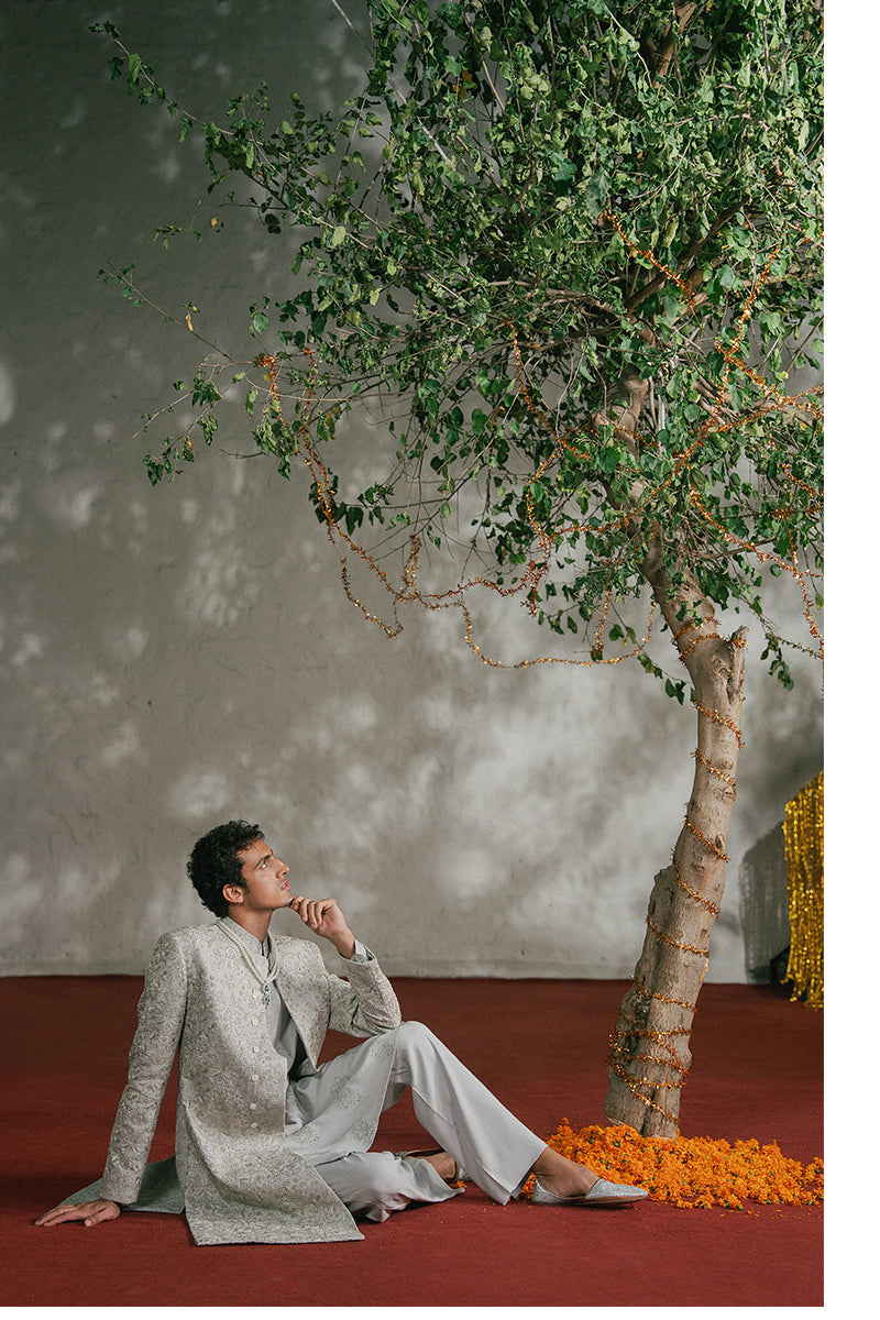 A sand grey embroidered kurta pajama set adorned with intricate motifs on tropical silk with resham threadwork, shimmering sequins and delicate katdana.