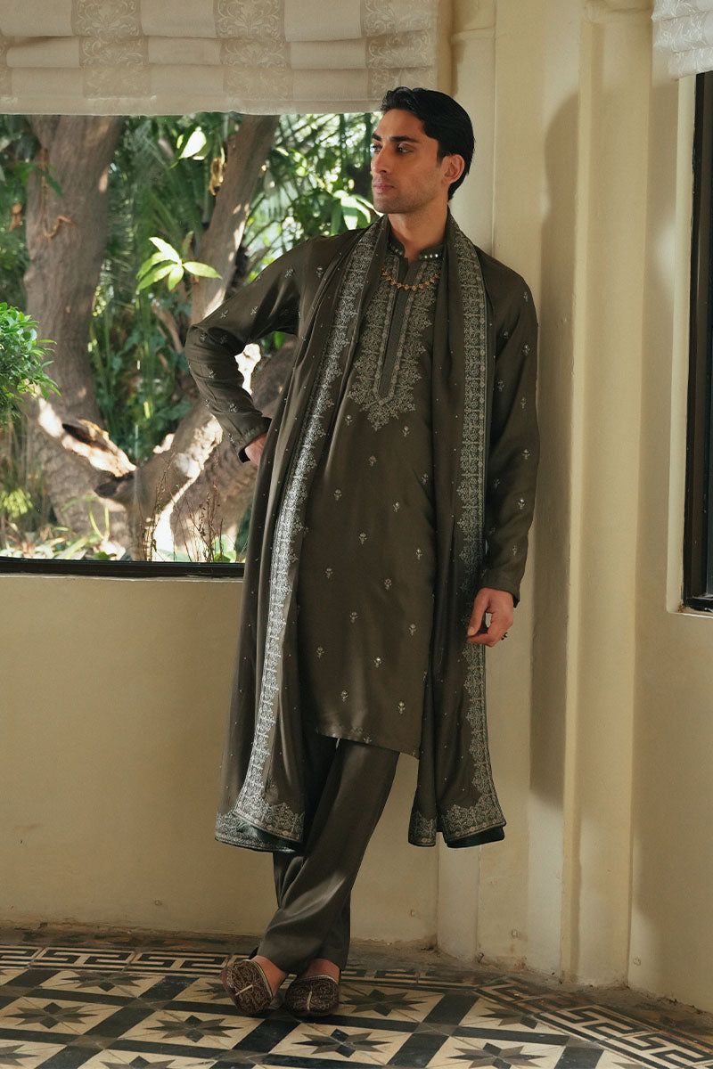A henna green kurta and pajama set with art deco inspired lattice patterns on the neckline with acanthus inspired suspended floral motifs. Further detailed with intricate resham and minimal tilla. Paired with embroidered mid-century floral pattern shawl.