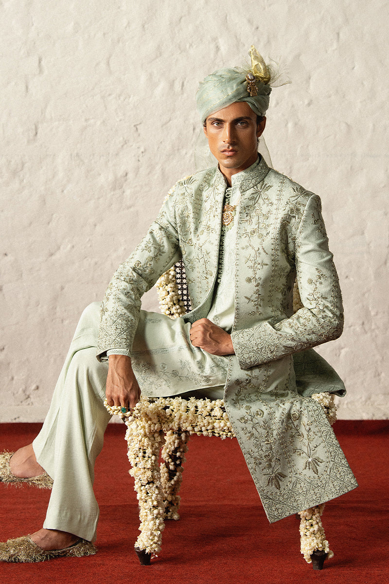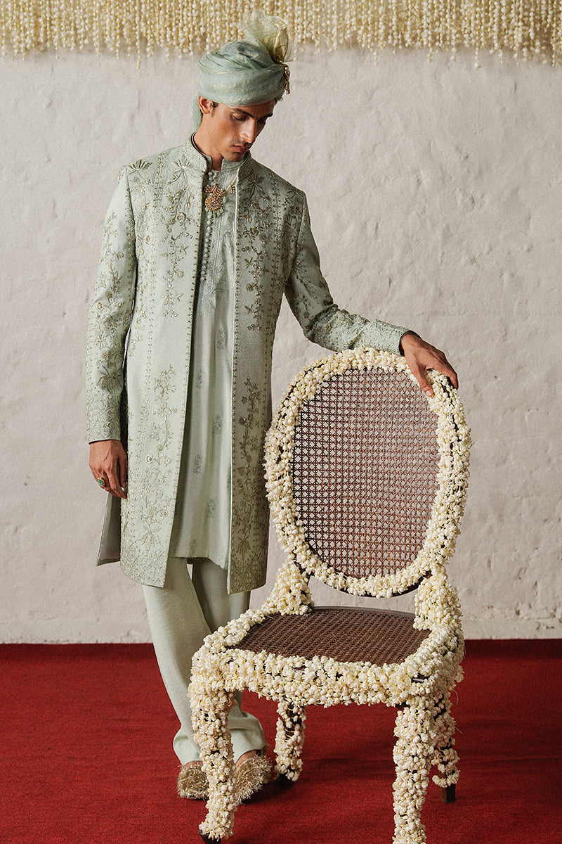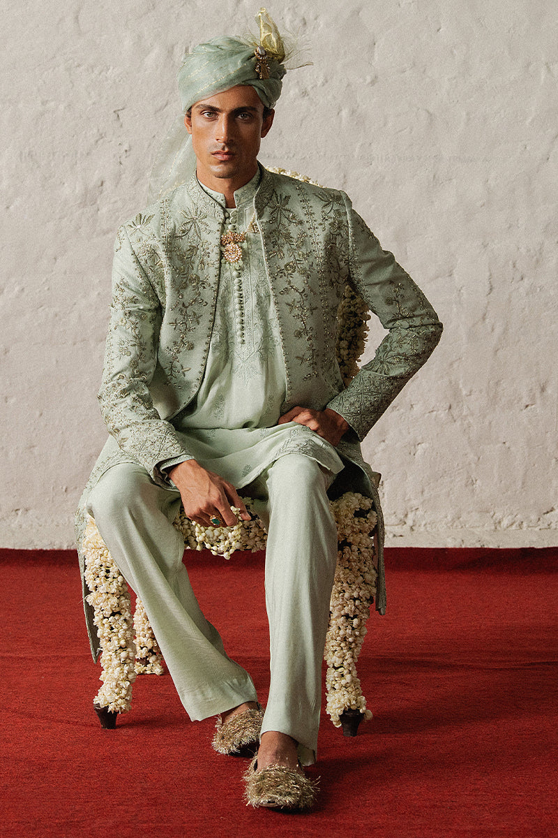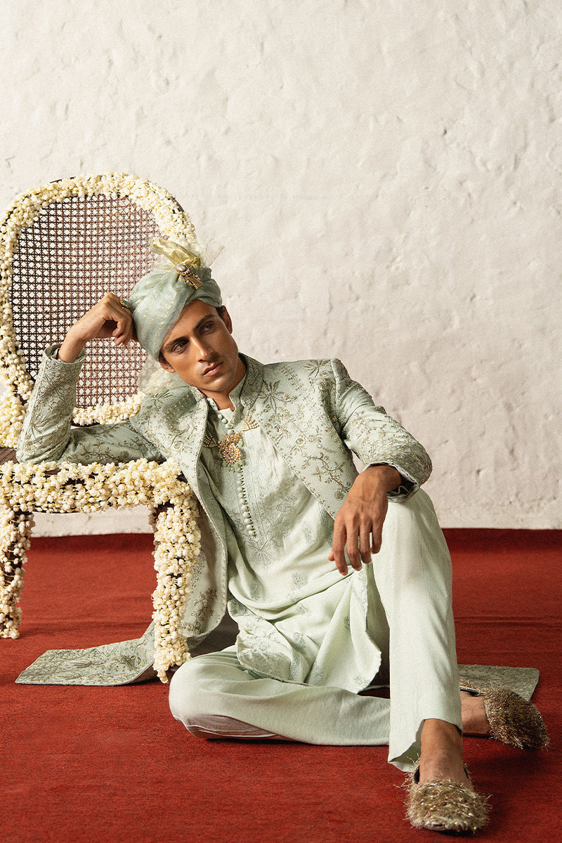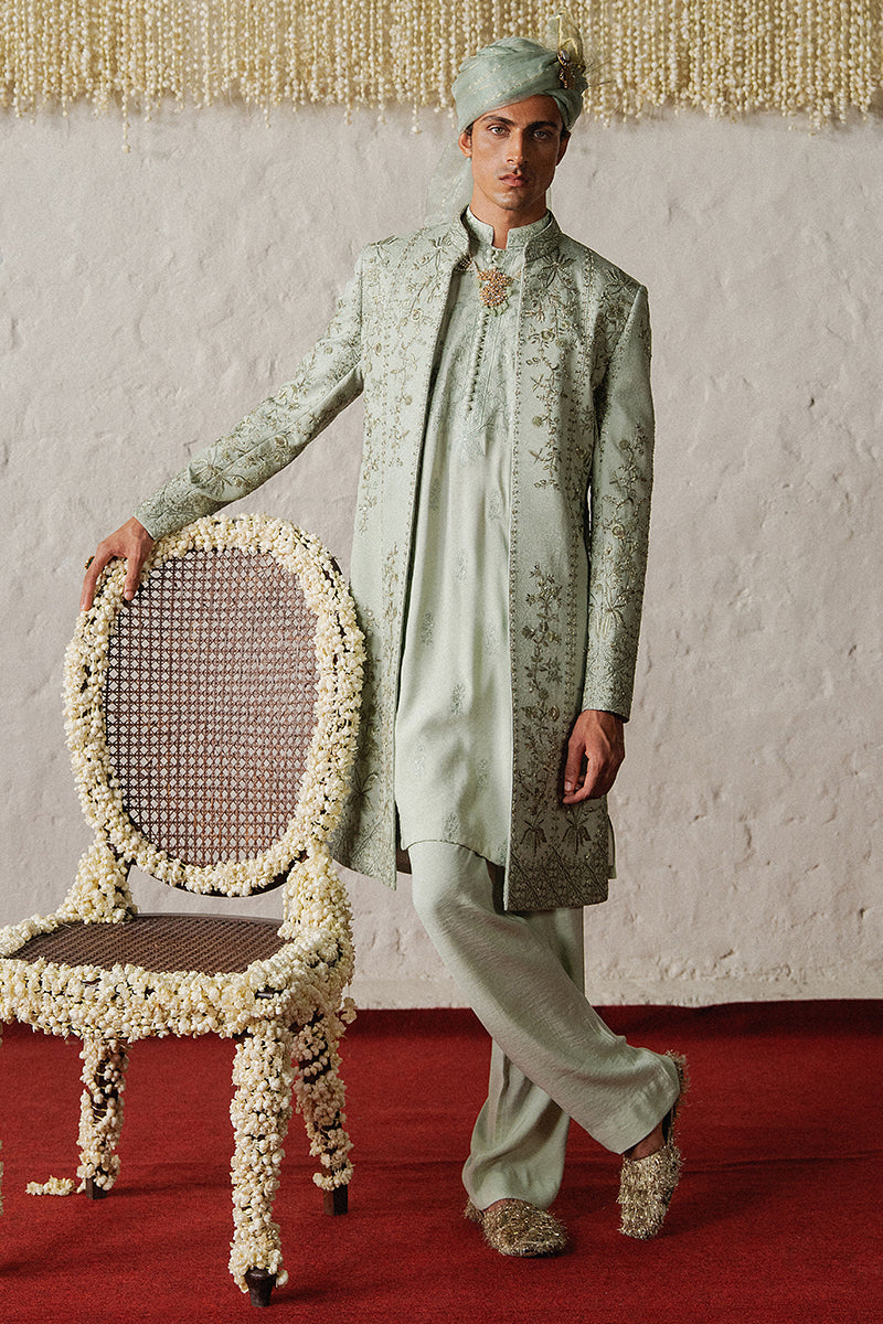 A mint green tropical satin kurta pajama set with intricate floral embroidered patterns, a blend of different shades of resham, tilla and katdana.