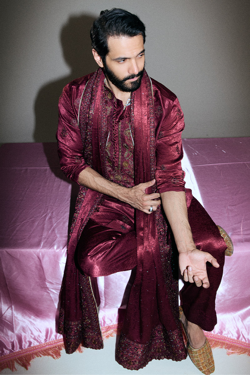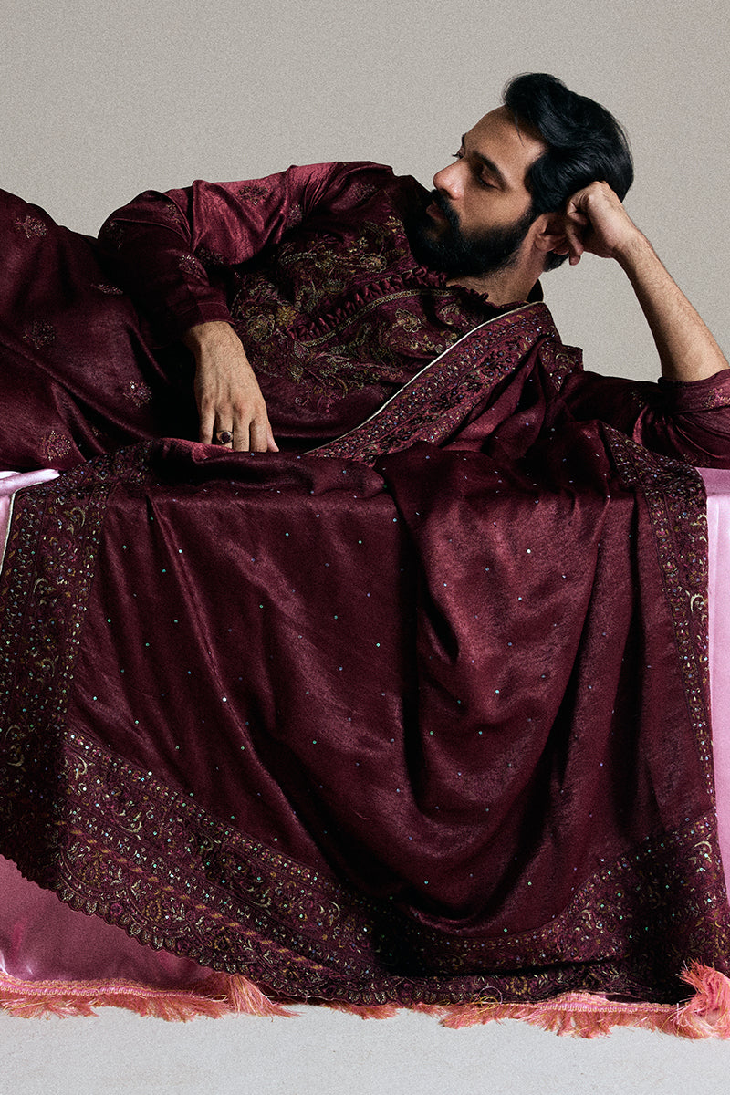 A deep burgundy kurta and pajama set adorned with striking floral embroidered composed neckline and all-over booti chatta accented with shimmering sequins, exuding opulence and refined elegance.