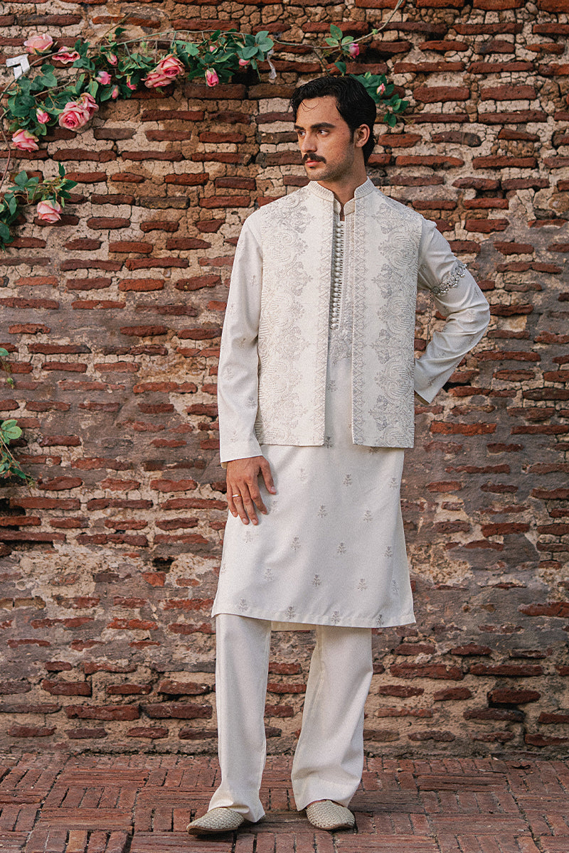 A pearl white tropical silk embroidered kurta and pajama set, embroidered with intricate floral pattern adorned with fine resham threadwork and traditional kangri Kora technique.