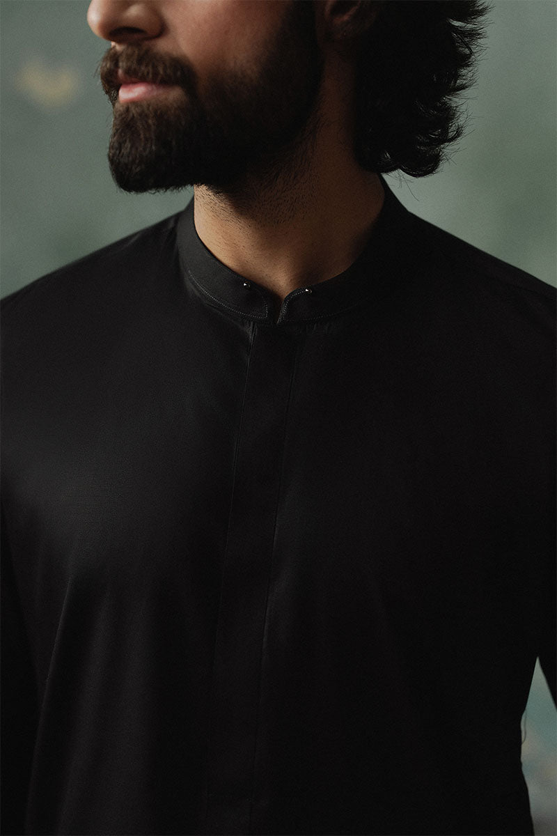 Classic black shalwar kameez with hidden placket. Detailed with silver metallic studs, box cut band collar and square cut cuffs.