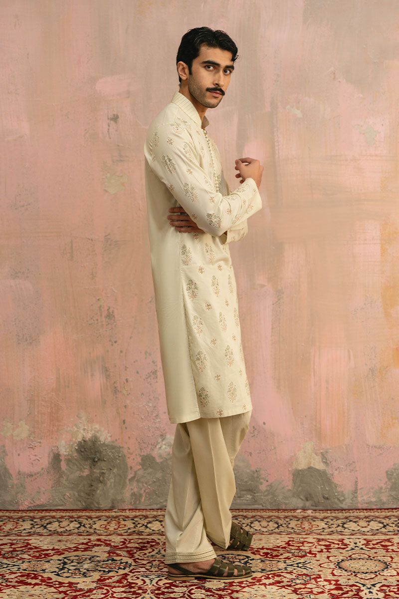 Mint green block-printed kurta shalwar with pleated band collar and loop button closures. Detailed with Dori embroidered shalwar bottom.