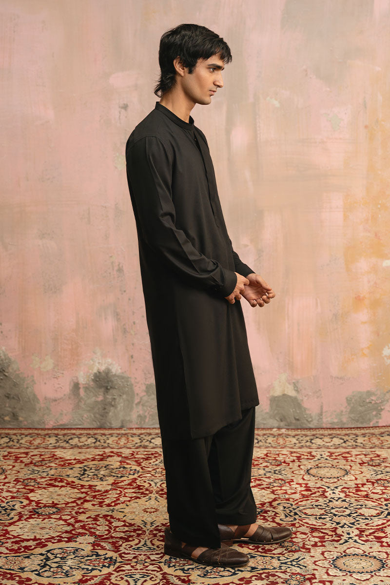 Classic ebony black premium cotton shalwar kameez. Meticulously designed and detailed with classic metallic buttons. Detailed with round cut band collar, hidden plcket and pleated cuffs.