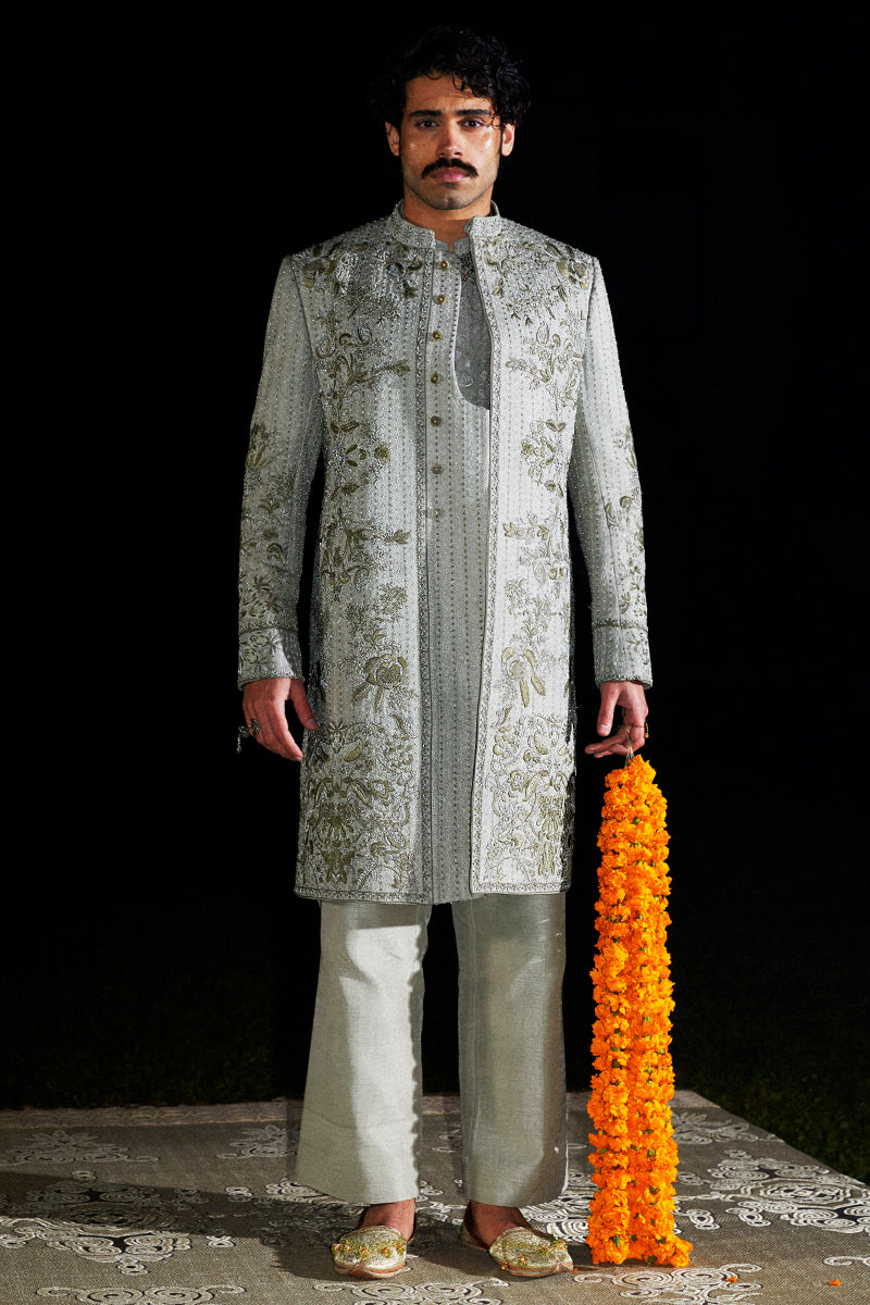 Meraki Sage Green Sherwani showcases a floral pattern made with intricate cutdana work. Adorned with delicate handmade resham French knots.