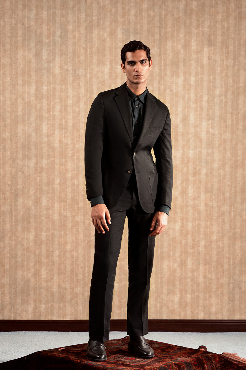 Black linen suit with a notch collar, detailed with besom pockets. Paired with straight tailored pants.