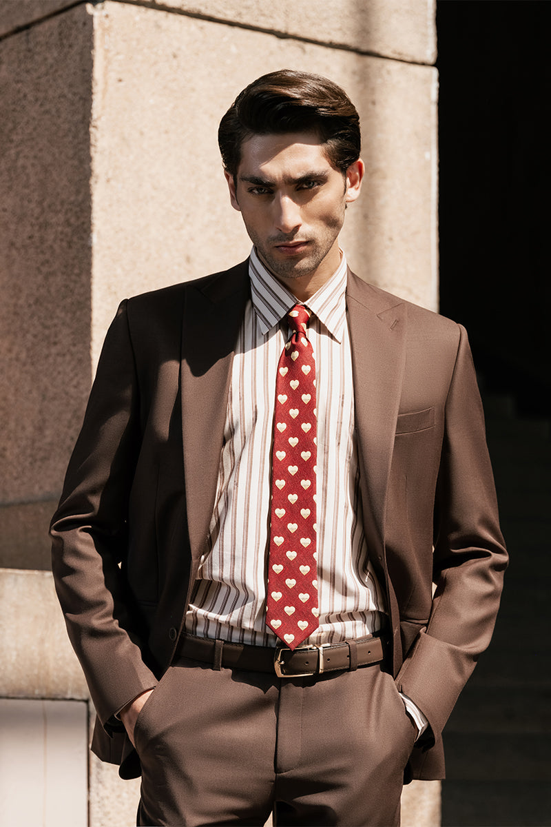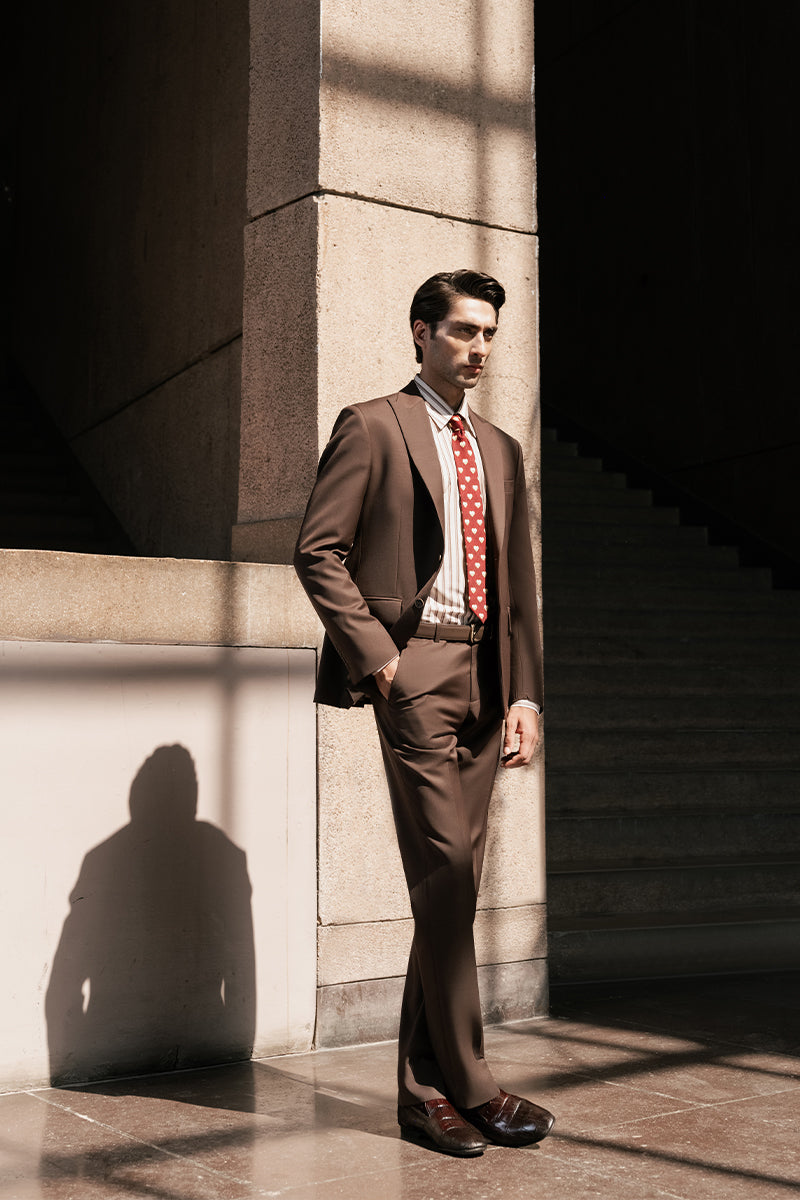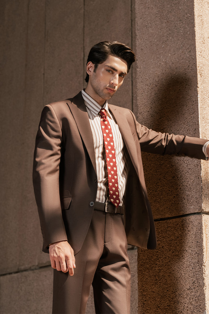 A tan brown single breasted two piece suit in a tropical wool fabric detailed with a peak lapel.