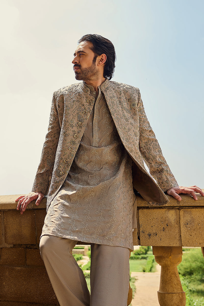 A subtle olive green tropical satin kurta pajama set, embroidered with intricate resham and tilla.