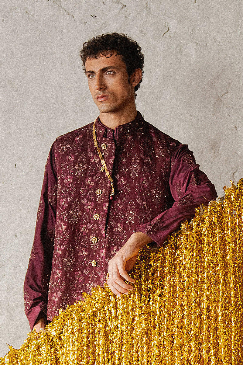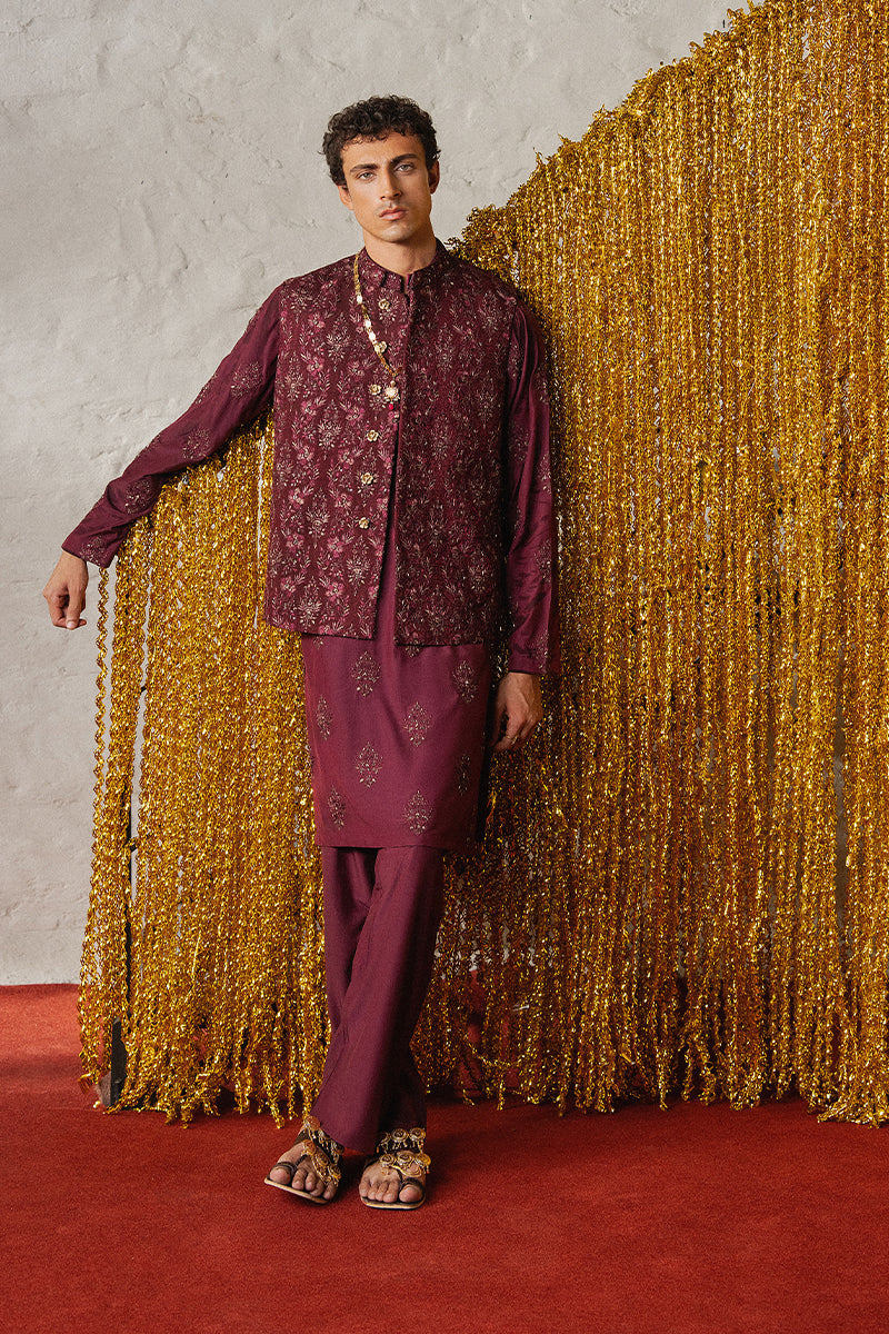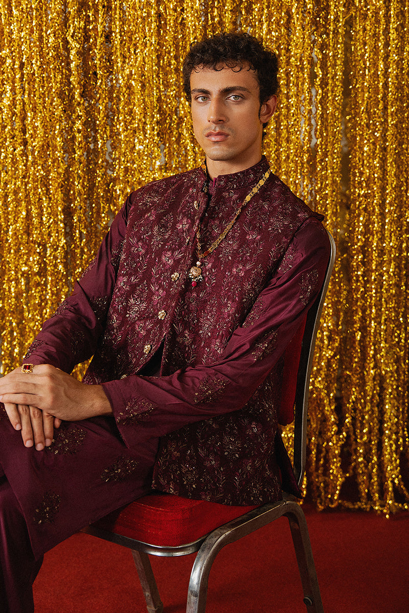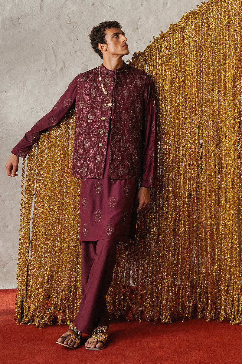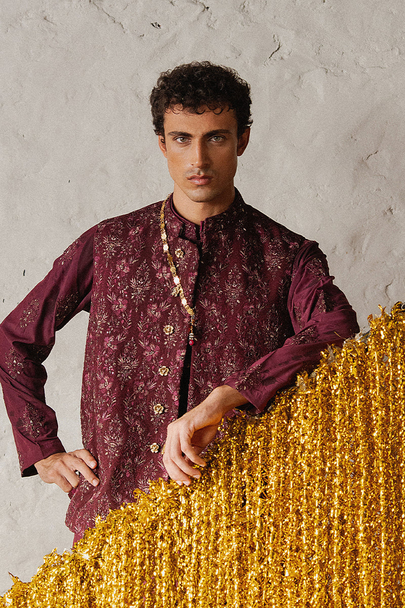 A deep burgundy waistcoat set adorned with intricate gold floral embroidered patterns on jacquard, featuring delicate French knots, opulent zardozi work, and fine resham threadwork exuding regal charm and festive elegance.