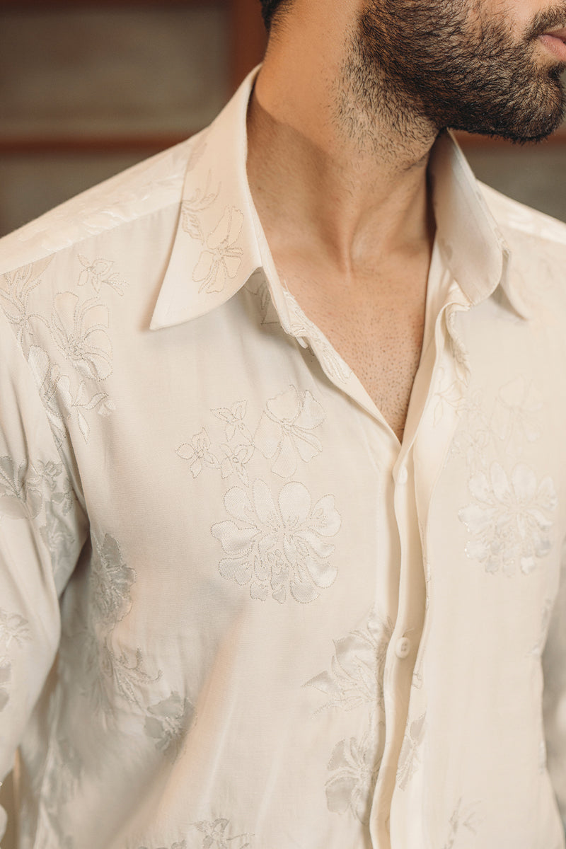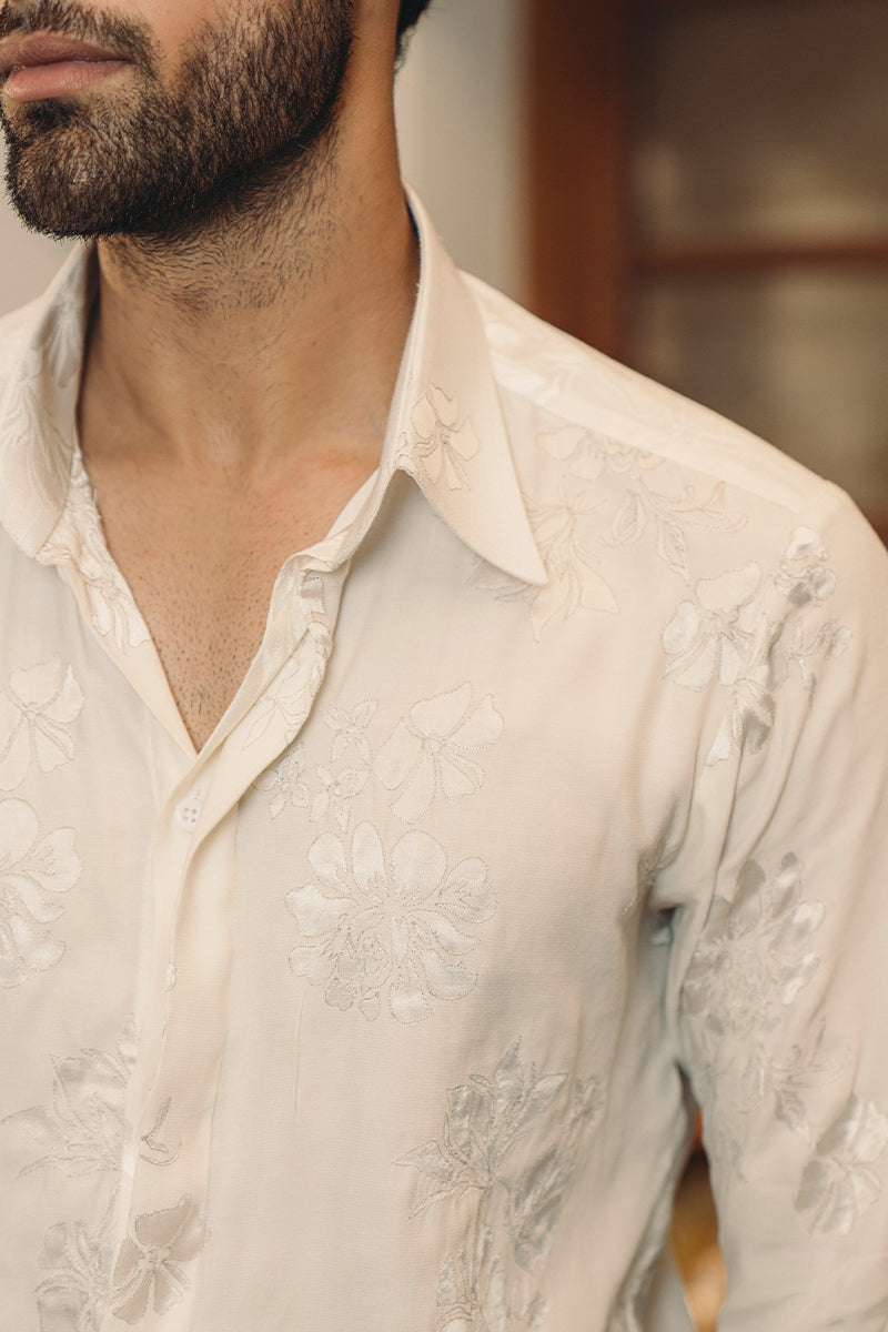 Pearl white, cotton satin embroidered shirt, with embroidered floral patter. Detailed with tilla embellishment and hidden button closure