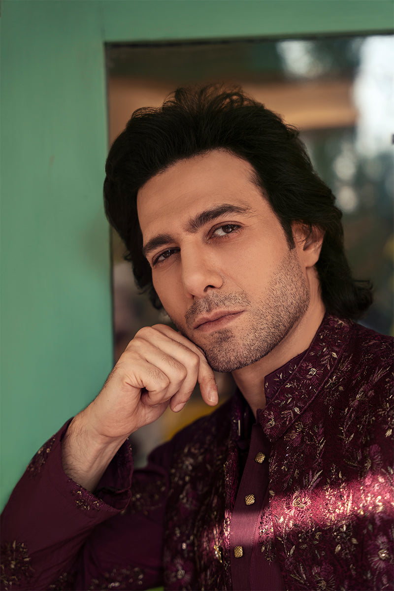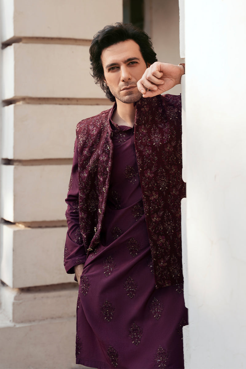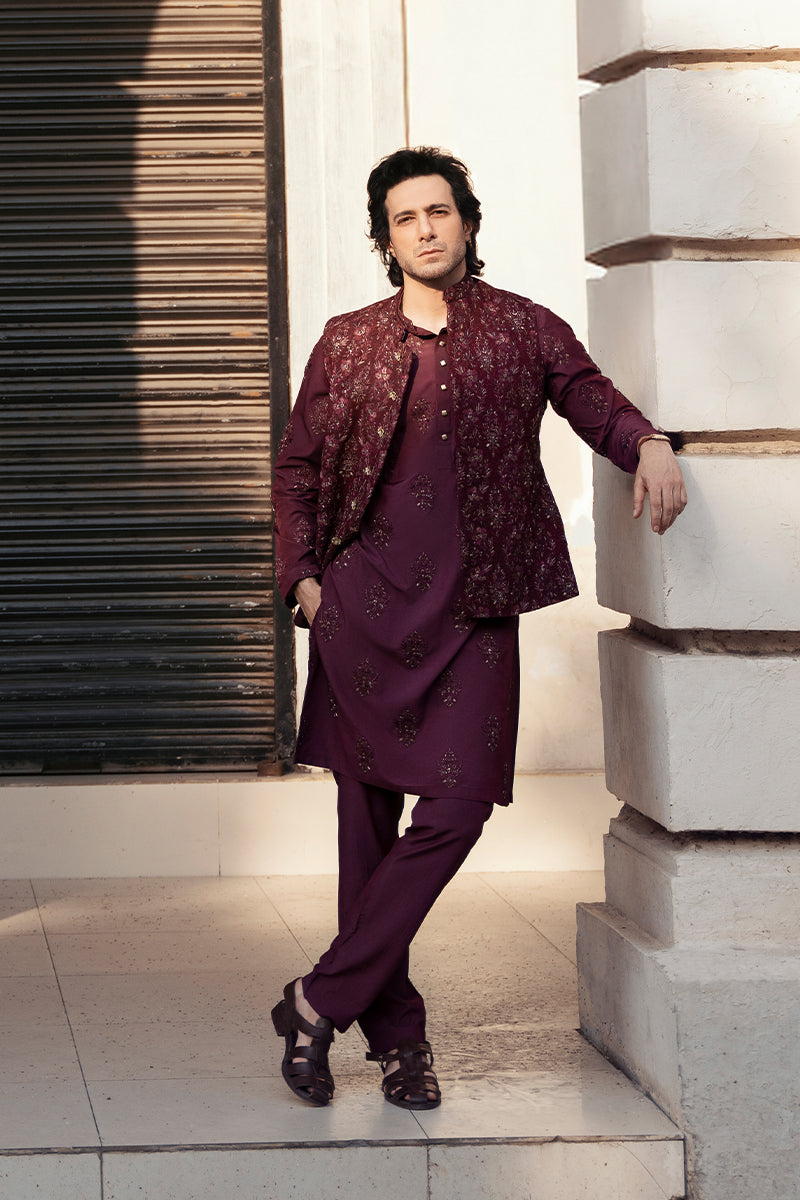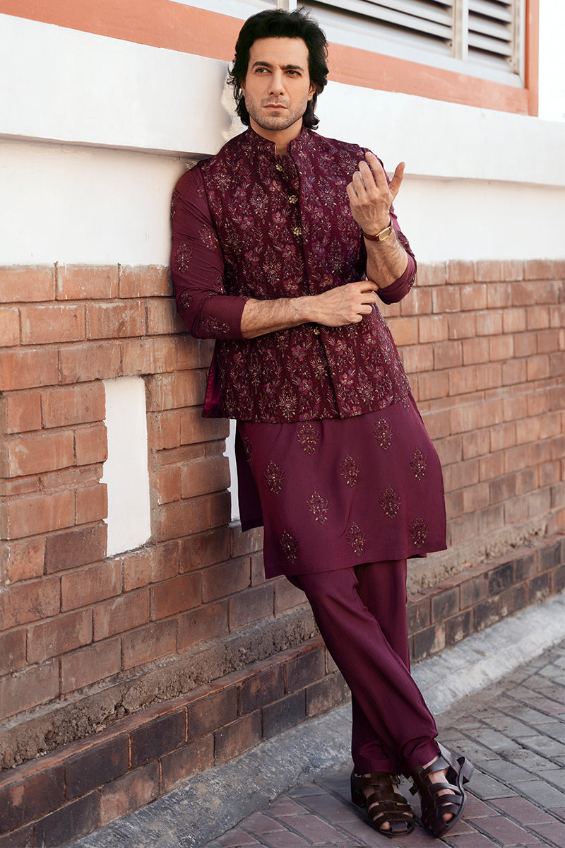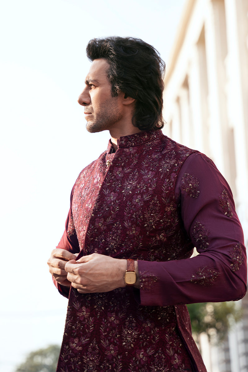 A deep burgundy waistcoat set adorned with intricate gold floral embroidered patterns on jacquard, featuring delicate French knots, opulent zardozi work, and fine resham threadwork exuding regal charm and festive elegance.